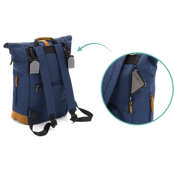 De wrap-around rugzak Berlin is niet alleen mooi om naar te kijken, maar ook uiterst praktisch. Met de rolsluiting kan het volume worden verhoogd van 20 liter naar 22 liter en bij volledige opening zelfs naar 25 liter. Met de praktische magnetische sluiting kan de lederen gesp in enkele seconden worden geopend. Bovendien is er een extra opening aan de achterkant om snel en gemakkelijk toegang te krijgen tot dingen die aan de onderkant zijn opgeborgen. Een praktisch vak aan de voorzijde biedt plaats aan de bijgeleverde aankleedkussentjes en een klein extra vakje aan de achterzijde biedt veilige opbergruimte voor de portemonnee, sleutels of andere belangrijke spullen en beschermt zo betrouwbaar tegen dieven. Aan de zijkanten zijn er nog twee praktische compartimenten voor flessen tot 0,5 liter. Een andere hoge light is dat een van hen is bekleed met een thermisch materiaal, wat betekent dat een babyflesje langer warm kan worden gehouden of, bij later gebruik, mama of papa’s drankje langer koel blijft.