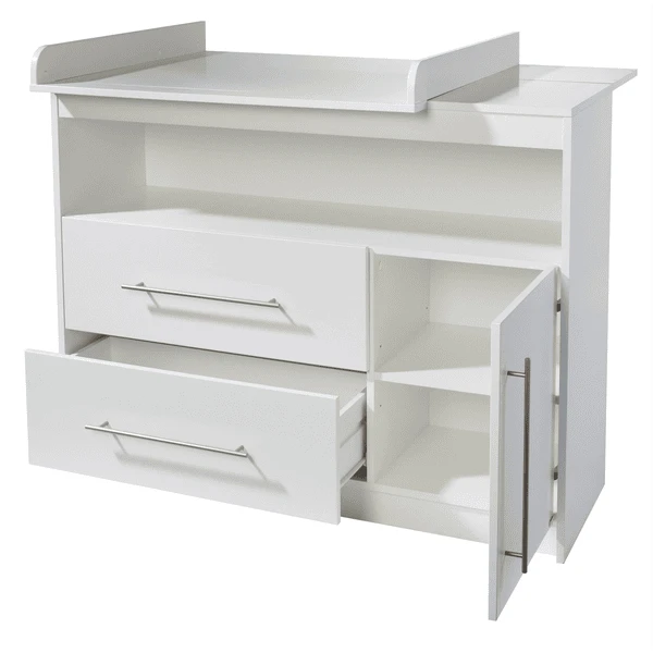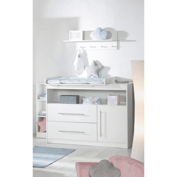 De meubels uit de roba kinderkamerserie “Maren” zijn volledig in het decor “wit” vervaardigd. Lange handgrepen van Metal l zijn aangepast aan het eenvoudige uiterlijk. De brede wisselende borstkas “Maren” is voorzien van een wisselend opzetstuk dat bescherming biedt en indien nodig kan worden verwijderd.