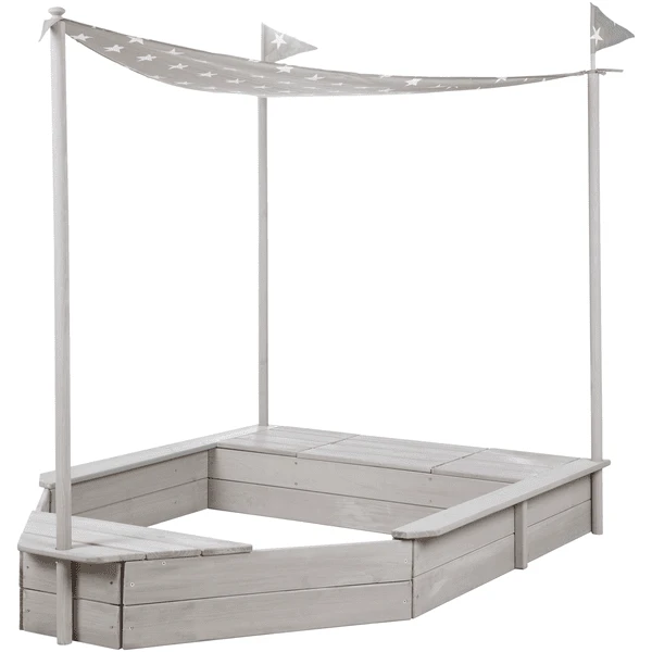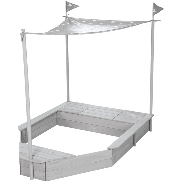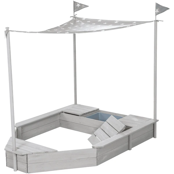 Het Sand box-schip is uitgerust met veel bergruimte, een zonnekap en twee vlaggen in de Little Stars Design . Dankzij het praktische opbergvak onder de bank vindt veel speelgoed daar een plaatsje en wordt zo beschermd tegen weer en wind. Hier is ook een plastic bak voor Sand .