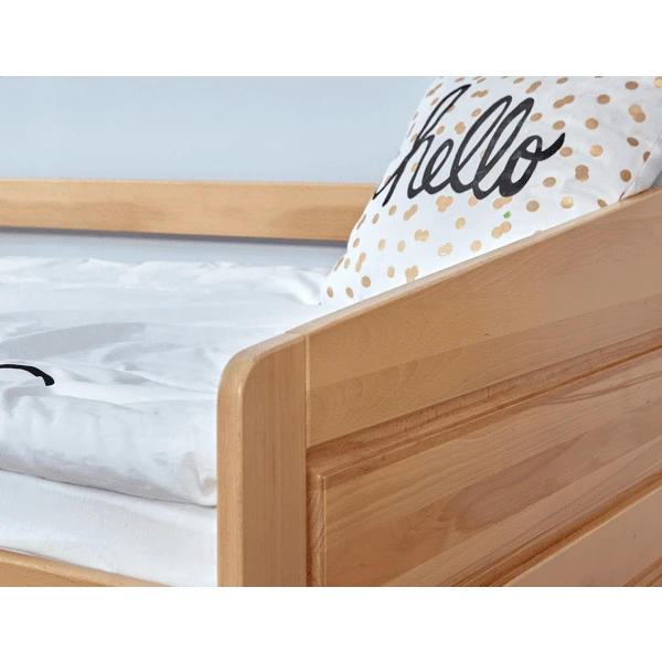 De Micki-slaapbank is het perfecte alternatief voor het normale bed in de kinder- en jeugdkamer. Het biedt een normaal ligvlak waarop het heerlijk ontspannen is, maar kan dankzij de rugleuning ook gebruikt worden als zitplaats voor meerdere personen. Het hele bed is gemaakt van massief beukenhout en overtuigt door zijn hoge stabiliteit en belastbaarheid.